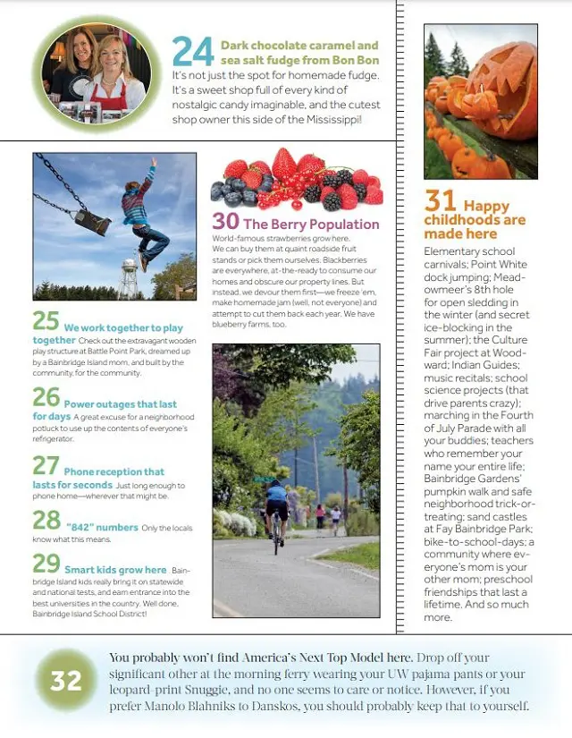 31 Happy childhoods are made here Elementary school carnivals; Point White dock jumping; Meadowmeer’s 8th hole for open sledding in the winter (and secret ice-blocking in the summer); the Culture Fair project at Woodward; Indian Guides; music recitals; school science projects (that drive parents crazy); marching in the Fourth of July Parade with all your buddies; teachers who remember your name your entire life; Bainbridge Gardens’ pumpkin walk and safe neighborhood trick-or-treating; sand castles at Fay Bainbridge Park; bike-to-school days; a community where everyone’s mom is your other mom; preschool friendships that last a lifetime. And so much more.